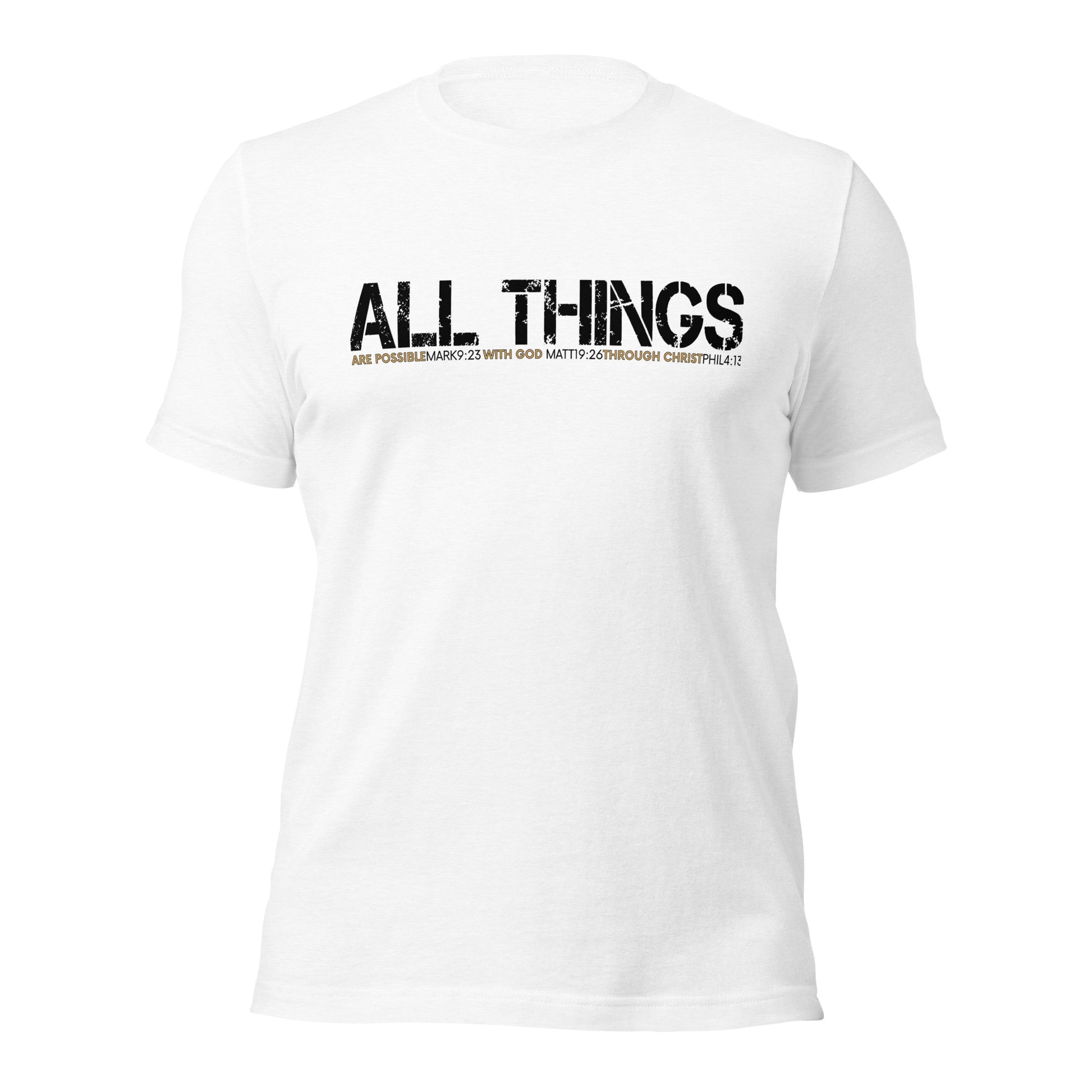 For warriors on the field, in the Gym or in life's daily battlefield, the ALL THINGS tee delivers premium comfort with a bold declaration of victory — Built on Mark 9:23, Matthew 19:26, and Philippians 4:13, this message carries the unshakable truth that ALL THINGS are possible with God, through Christ.
